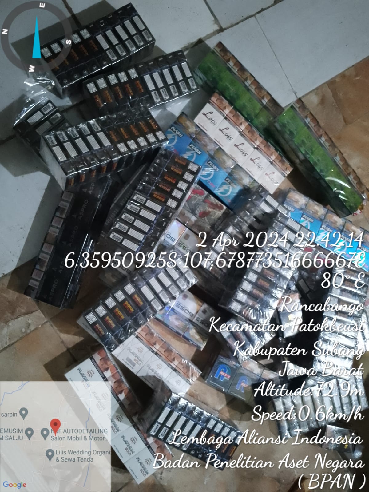 Sumber tersebut mengatakan bahwa menurutnya di daerah Rancabogo kecamatan patok besi kabupaten Subang Jawa Barat, saat ini terciduk oleh team investigasi DPP Aliansi Indonesia BPAN Jakarta, rokok tanpa cukai siap di edarkan oleh agennya tersebut di berbagai daerah di wilayah subang.