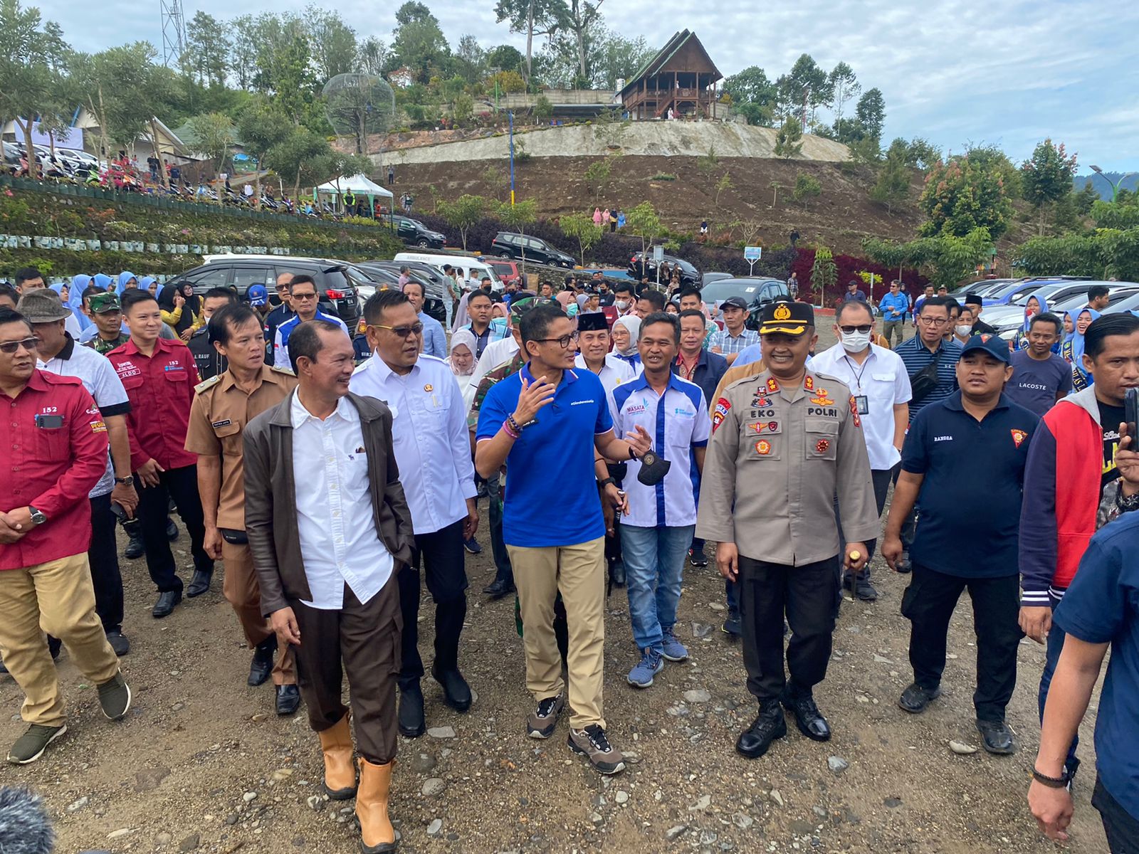Kapolres Lahat AKBP Eko Sumaryanto, S.I.K., bersama MENPAREKRAF-RI. Dr. H. Sandiaga Salahuddin Uno, BBA., MBA. Saat Kunker ke Agrowisata Sindang Panjang Kecamatan Tanjung Sakti PUMI, Kabupaten Lahat, Sumatera Selatan. Rabu, 14 September 2022.