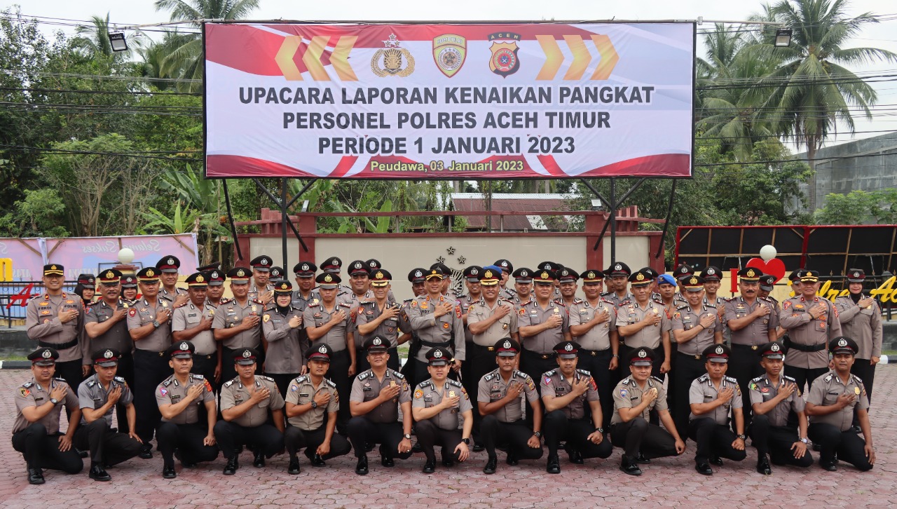 Sriwijayatoday.com | Aceh Timur – Kapolres Aceh Timur AKBP Andy Rahmansyah S.I.K. memimpin Upacara Laporan Kenaikan Pangkat Personel Polres Aceh Timur Periode 1 Januari 2023 di Lapangan Apel Sarja Arya Racana, Selasa, (03/01/2023).