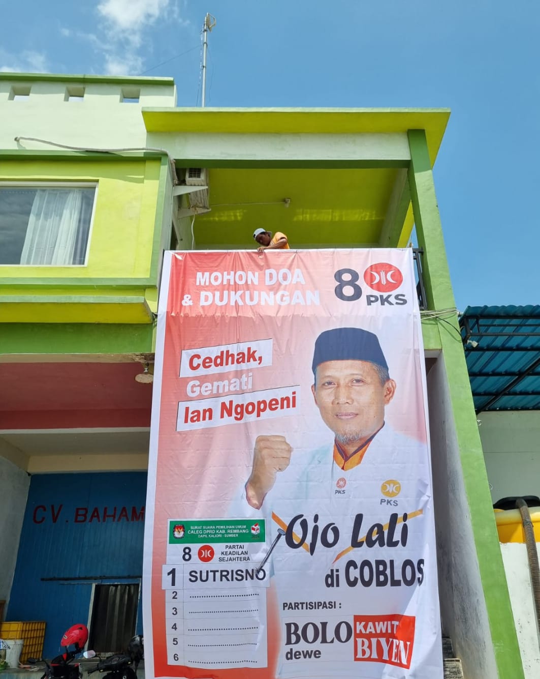 Ada salah satu baliho caleg yang terpampang di titik-titik pasang di beberapa desa terlihat khas dan berbeda. Baliho caleg tersebut dibuat dan dipasang sendiri oleh tim sukses di desa masing-masing. Baliho itu adalah APK caleg dari Partai Keadilan Sejahtera (PKS) nomor urut 1 Dapil VII Kaliori-Sumber, Sutrisno.