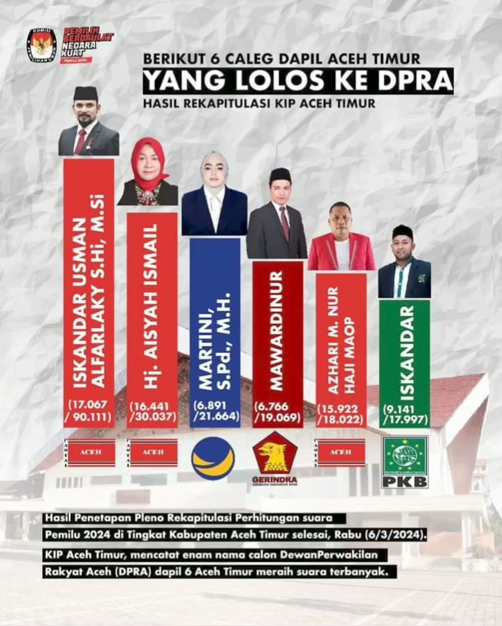 tercatat enam nama calon Dewan Perwakilan Rakyat Aceh (DPRA) dapil 6 Aceh Timur meraih suara terbanyak, Hasil rekapitulasi KIP Aceh Timur. Rabu (6/3/2024).