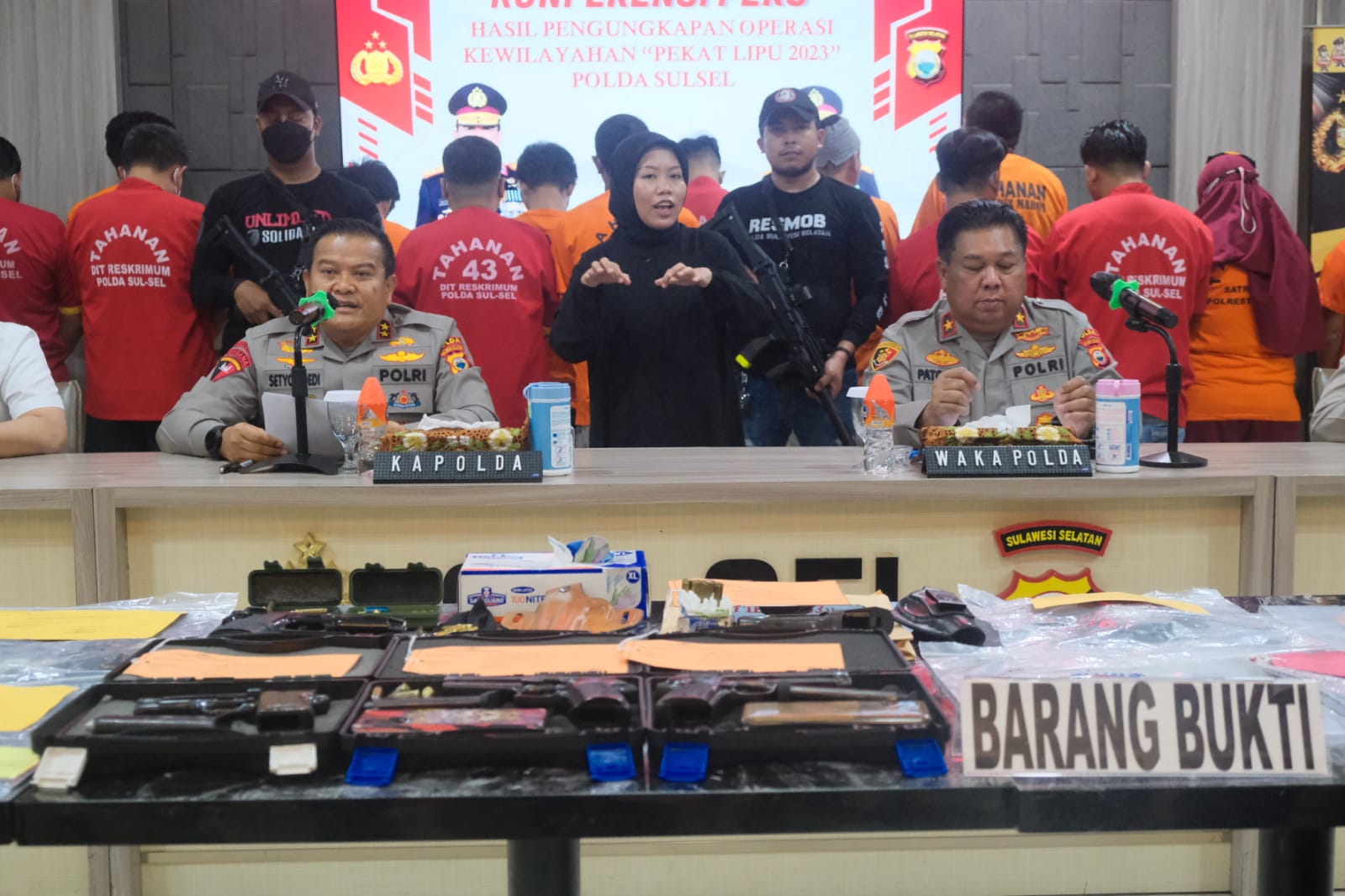 “Pagi hari ini Ditreskrimum Polda Sulsel mengelar kasus pengungkapan operasi Pekat Lipu 2023 yang digelar selama 20 hari, dari tanggal 04 sampai dengan 23 Agustus ,” kata Kapolda Sulsel yang didampingi Wakapolda Sulsel.