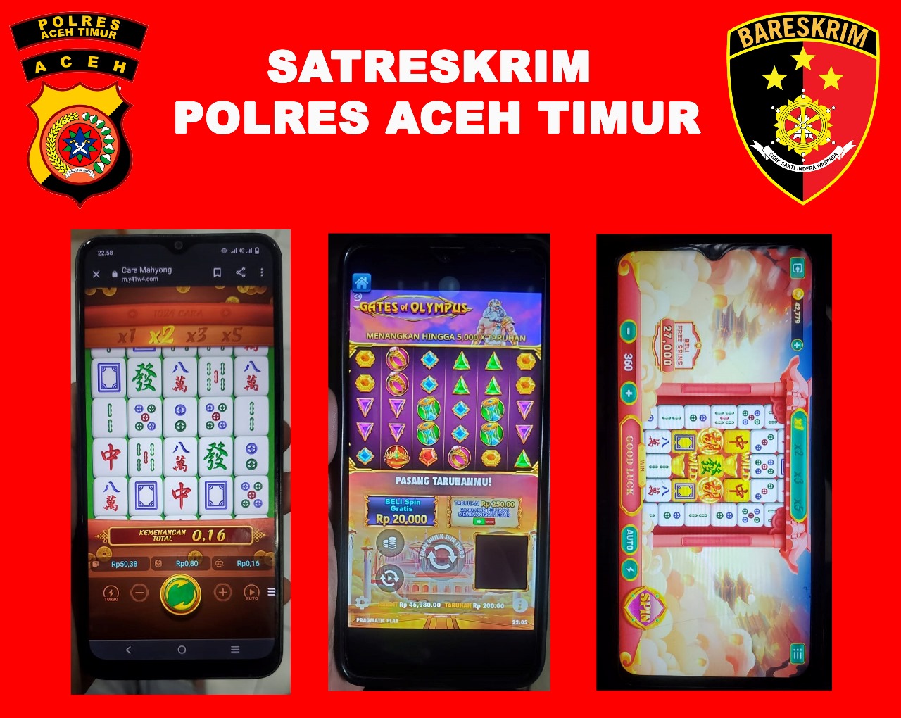 “Bersama ketiga pelaku kami juga mengamankan sejumlah barang bukti yang berkaitan dengan tindak pidana judi online, yakni; 3 (tiga) unit handphone. Sedangkan alat bukti yang kami sita diantaranya; Dokumentasi akun judi online pada aplikasi judi online; dokumentasi permainan jarimah maisir/judi online Mahjong Ways 2 dan dokumentasi transaksi pengiriman saldo untuk deposit masing masing para pelaku,” sebut Kasat Reskrim Polres Aceh Timur Iptu Adi Wahyu Nurhidayat, S.TrK.,S.I.K.