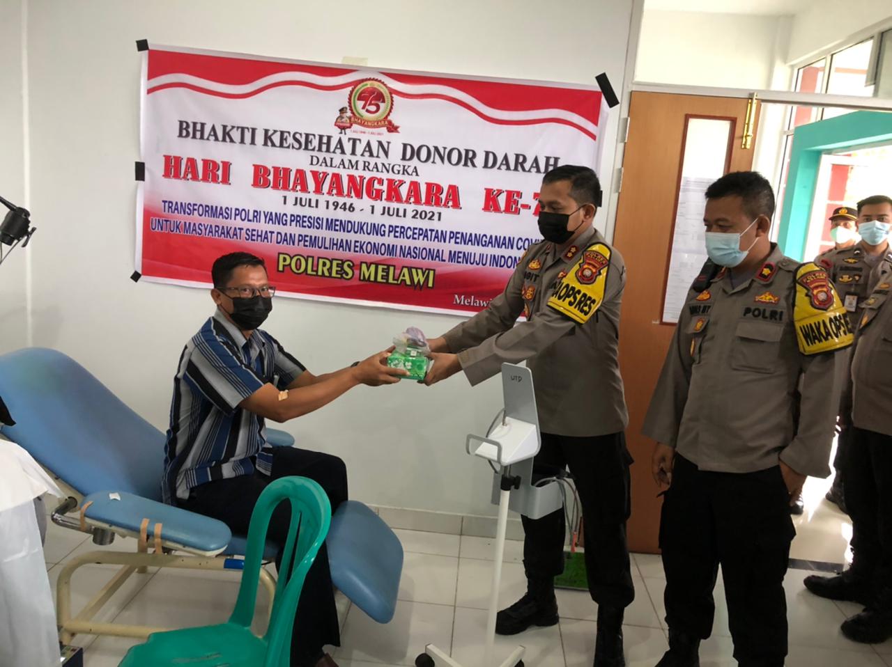 Kapolres Melawi AKBP Sigit Eliyanto Nurharjanto, S.I.K menuturkan kegiatan sosial donor darah merupakan rangkaian kegiatan untuk memperingati Hari Bhayagkara ke-75 pada 1 Juli 2021 nanti, Dimana Polri turut peduli terhadap kebutuhan ketersediaan darah di Rumah Sakit untuk membantu masyarakat.