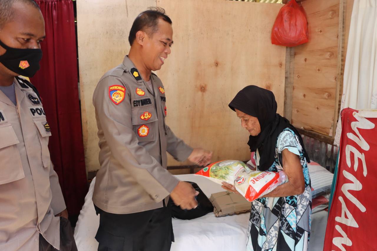 Didampingi Bhabinkamtibmas Kelurahan Sombalabella Aipda Ilham, Kompol Edy Marheno menyerahkan bingkisan paket sembako berupa beras, telur, gula, dan minyak goreng kepada ibu sohra.