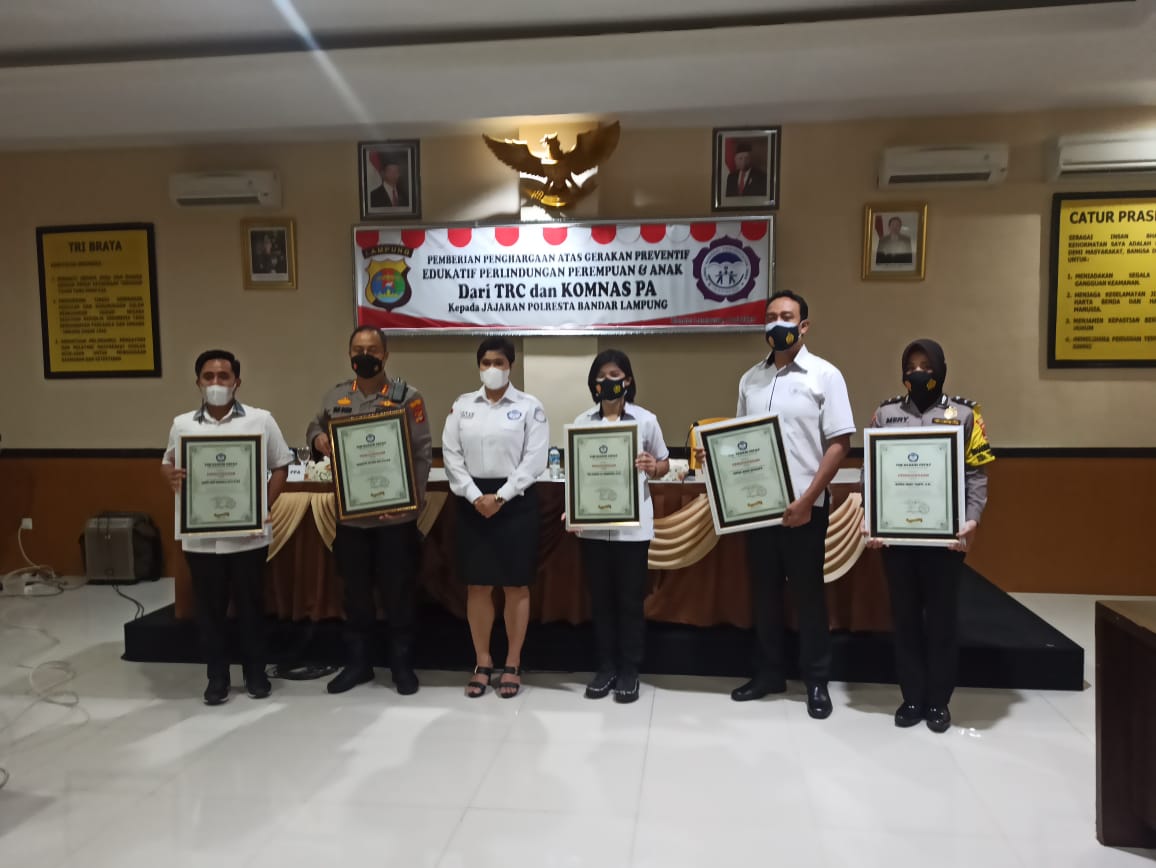 Sriwijayatoday.com Bandar Lampung, Pemberian penghargaan oleh Tim Reaksi Cepat Perlindungan Perempuan dan Anak ( TRC PPA ) dan Komnas Anak atas gerakan preventif dan edukatif terhadap perempuan dan anak diberikan kepada Polresta Bandar Lampung pada hari Senin, (29/06).