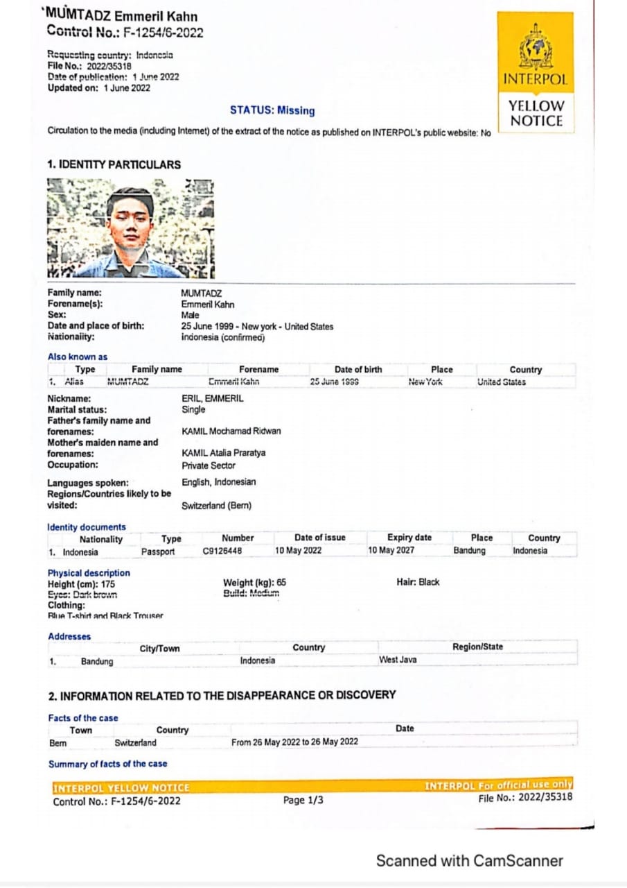 Dedi menjelaskan, dengan terbitnya Yellow Notice tersebut, seluruh negara yang menjadi anggota Interpol telah menerima informasi kehilangan anak dari Ridwan Kamil tersebut.