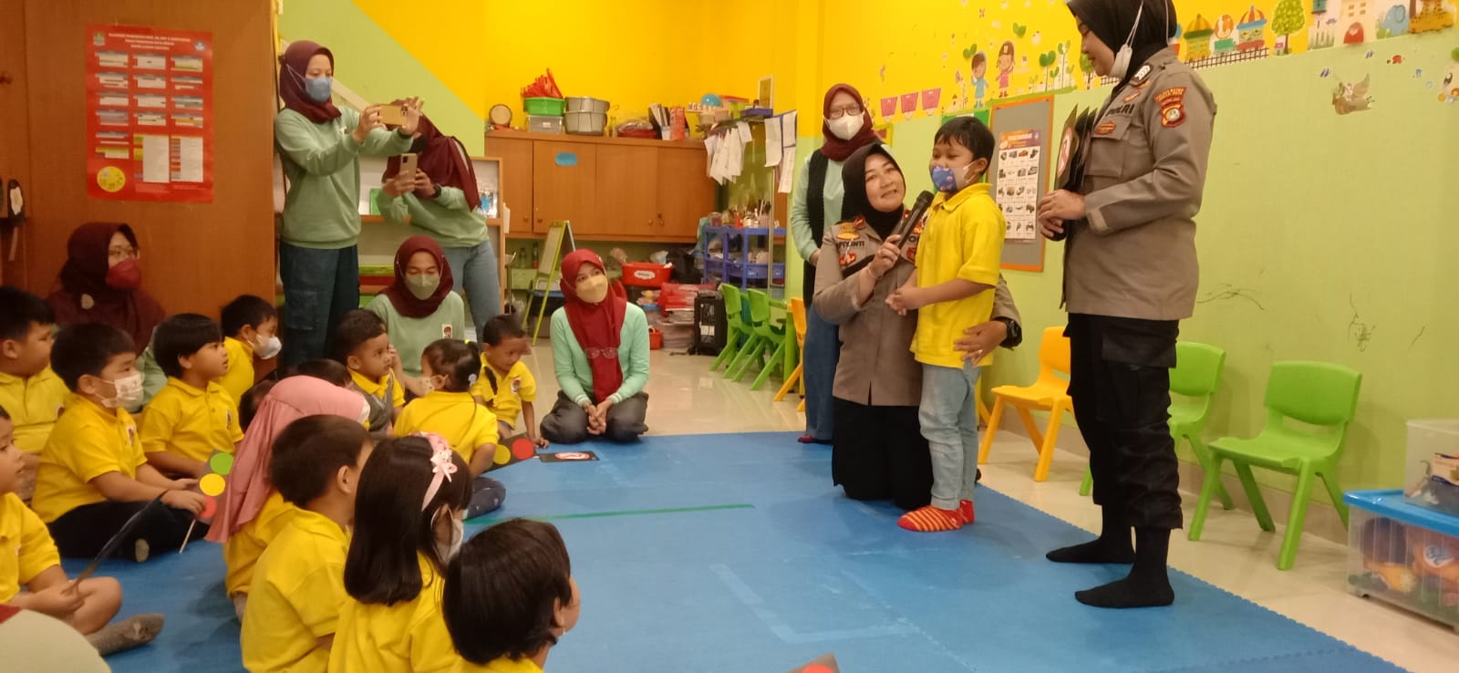 Bhabinkamtibmas kelurahan Jaka Setia Aiptu M Fathulloh bersama anggota Polsek Bekasi Selatan pimpinan Iptu Novianti mendampingi dan pengarahan dalam rangka edukasi polisi sahabat anak di PAUD KB Omah Main bertempat di Ruko Rose garden RRG 7 no.6 kel.Jaka Setia Kec. Bekasi Selatan, Rabu (15/3/2023).