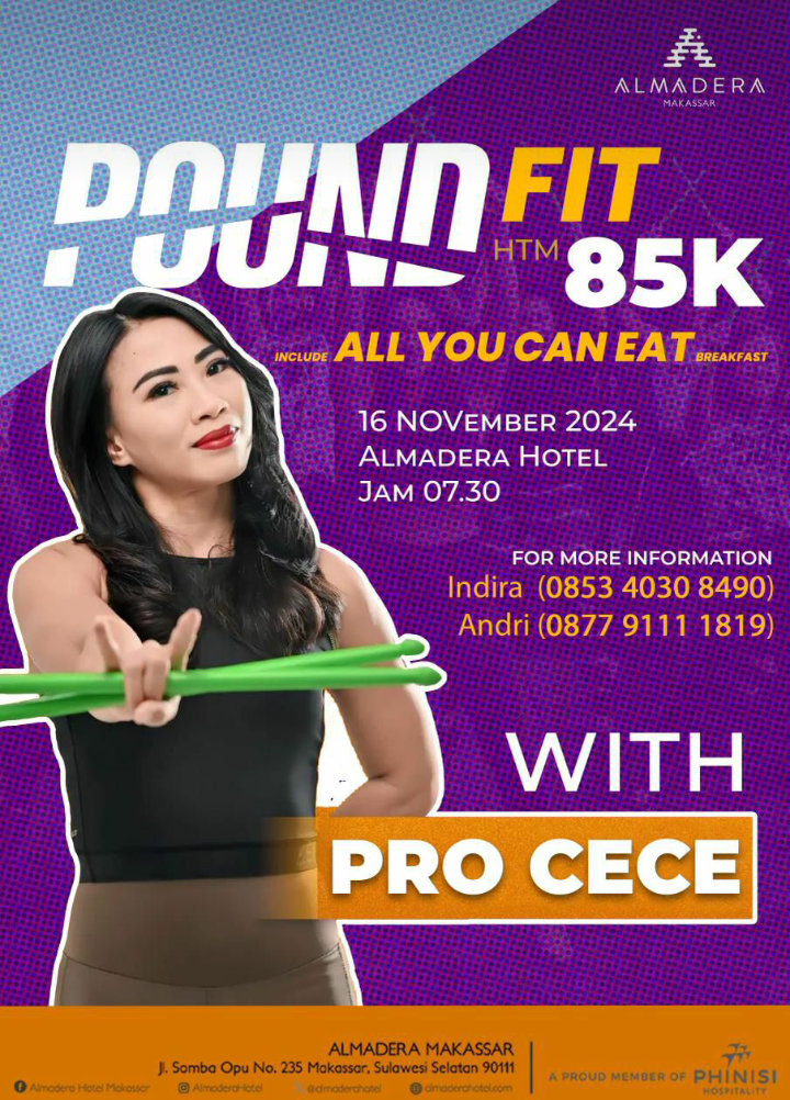 Hotel Almadera Makassar akan menyelenggarakan kelas Pound Fit pada tanggal 16 November 2024, pukul 07.30 WITA. Kelas ini akan dipandu oleh Pro Cece, seorang instruktur profesional. Harga tiket masuk adalah Rp 85.000,- dan sudah termasuk makan sepuasnya ( all you can eat) serta sarapan.