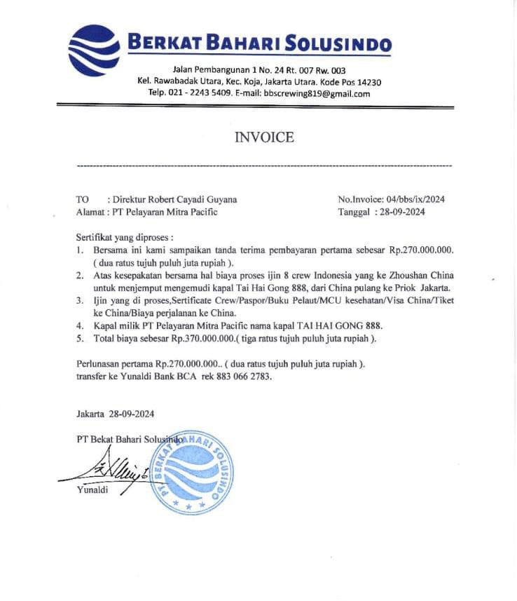Jakarta, – PT. Berkat Bahari Solusindo Diduga Lakukan Kliem Asuransi Dokumen Palsu Yang Perusahaan Tersebut Di Bawah Pimpinan Yunaldi Alias Pak Ayun, Melakukan Pemalsuan tanda tangan Seorang Karyawan Captain Kapal Atasnama Jefery.