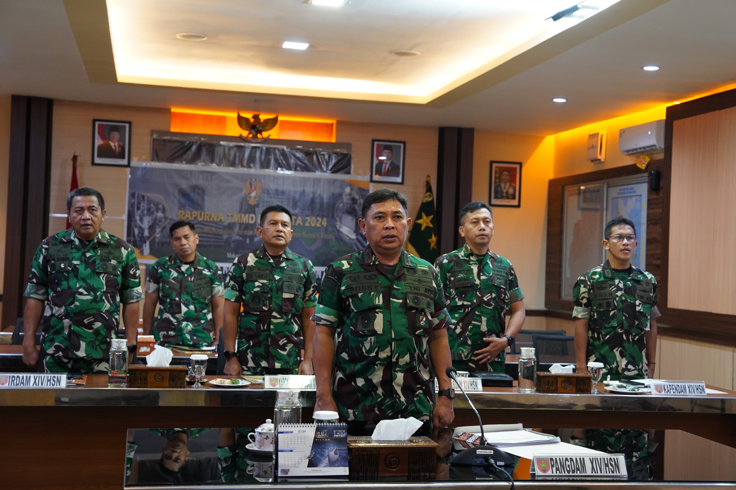 Sriwijayatoday.com // Makassar – Pangdam XIV/Hasanuddin Mayjen TNI Bobby Rinal Makmun, S.I.P., didampingi sejumlah Pejabat Utama (PJU) Kodam, mengikuti rapat paripurna (Rapurna) TNI Manunggal Membangun Desa (TMMD) ke-45 TA 2024 secara virtual terpusat dari Mabesad Jakarta Pusat, yang dipimpin oleh Wakil Kepala Staf Angkatan Darat (Wakasad) Letnan Jenderal TNI Tandyo Budi R, S.Sos., bertempat di Ruang Vicon Puskodalopsdam, Jl. Urip Sumoharjo, Kota Makassar. Kamis, (5/12/2024).