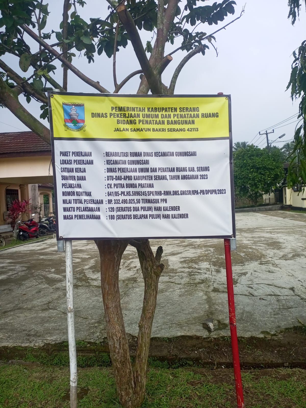 Proyek Pembangunan Rehabilitasi Rumah Dinas Kec. Gunung Sari dari satuan kerja Dinas (PUPR) Pekerjaan umum Dan Penataan ruangan Kab Serang DI duga Tidk sesuai dgn spek, Selasa (13/06/2023).