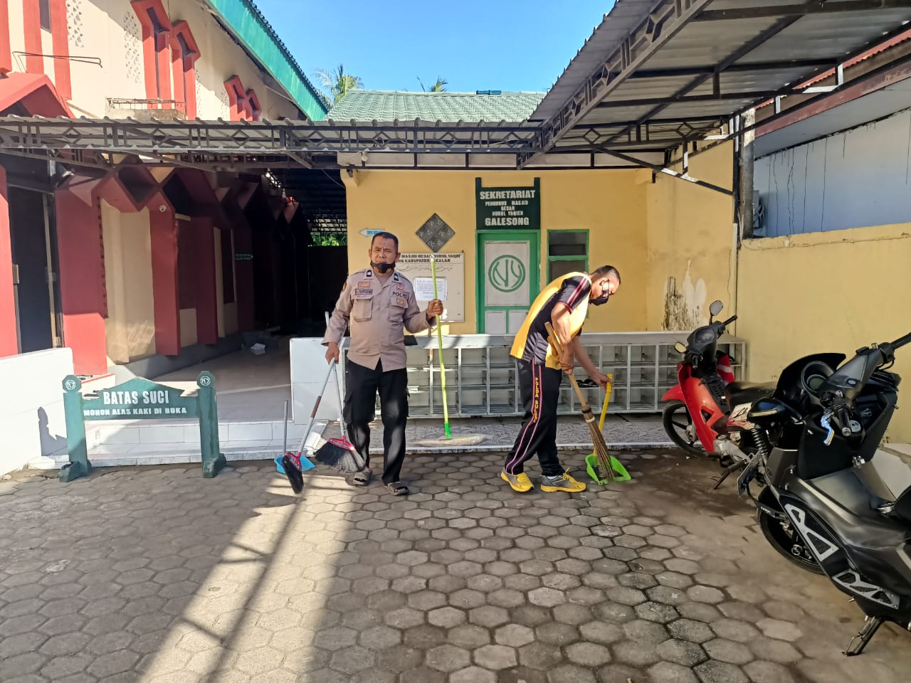 Dengan momen kegiatan Bakti Sosial ini, personel Kepolisian Polsek Galsel membersihkan lingkungan Masjid Besar Nurul Yakin Galesong, Kecamatan Galsel, Kabupaten Takalar, Jumat (10/6/2022).