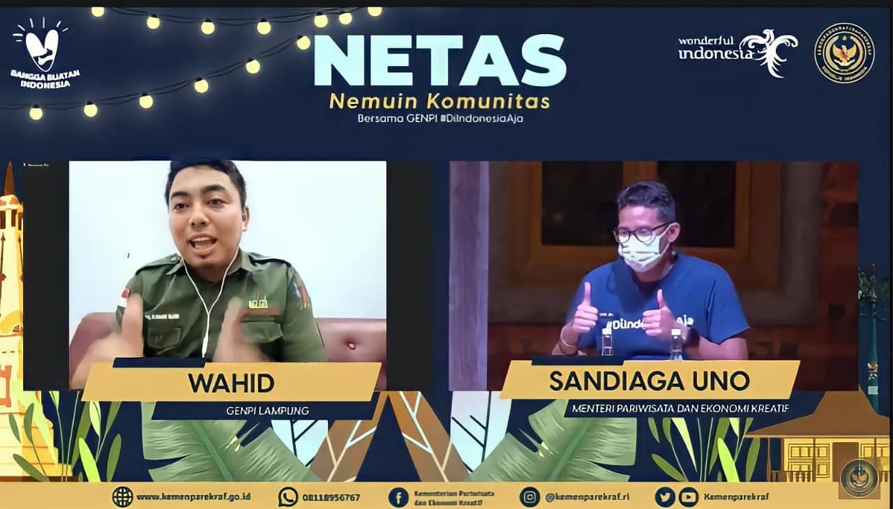 Sriwijayatoday.com Bandar Lampung, Menteri Pariwisata dan Ekonomi Kreatif (Menparekraf) Republik Indonesia, Sandiaga Salahuddin Uno, akan jadwalkan pertemuan dengan GenPi Provinsi Lampung. Pernyataan tersebut terungkap saat Nemuin Komunitas (Netas) yang digelar oleh Kementerian Pariwisata dan Ekonomi Kreatif (Kemenparekraf) melalui zoom meeting, bersama para sobat GenPi serta seluruh Kepala Dinas Kepemudaan, Olahraga dan Pariwisata se-Indonesia.