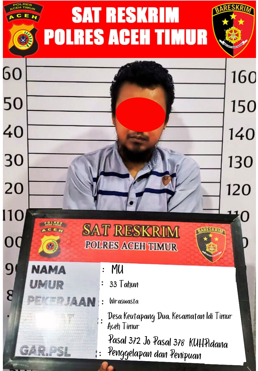 Sriwijayatoday.com | Aceh Timur — Satuan Reskrim Polres Aceh Timur Polda Aceh mengamankan MU (29 Tahun), warga Desa Keutapang Dua, Kecamatan Idi Timur pelaku penipuan dan penggelapan. MU diduga melakukan penipuan terhadap Muhammad Ayub, (43 Tahun) warga Desa Seuneubok Rambong, Kecamatan Idi Rayeuk.