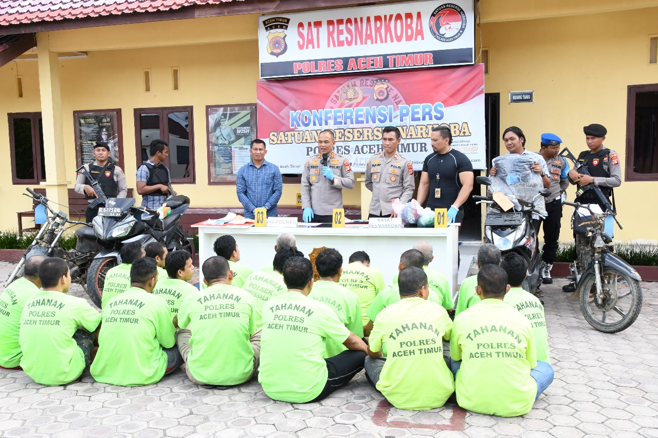 Aceh Timur | Sriwijayatoday.com – Satuan Reserse Narkoba Polres Aceh Timur mengungkap sebanyak 19 pelaku tindak pidana narkotika selama kurun waktu satu bulan terhitung mulai pertengahan bulan Juli hingga pertengahan bulan Agustus 2023 dan dari tangan para pelaku, petugas mengamankan barang buki narkotika jenis sabu dan ganja.