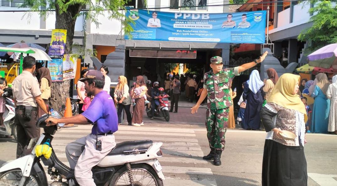 Kota Serang – Guna memberikan kenyamanan dan keamanan, Babinsa Koramil 0602-02/Kasemen Kodim 0602/Serang Sersan Kepala (Serka) Miftah, membantu menyeberangkan anak sekolah SMA Negeri Negeri 4 Kota Serang seusai pulang sekolah, bertempat di Wilayah Kecamatan Kasemen Kota Serang Provinsi Banten, Jum’at (21/06/2024)