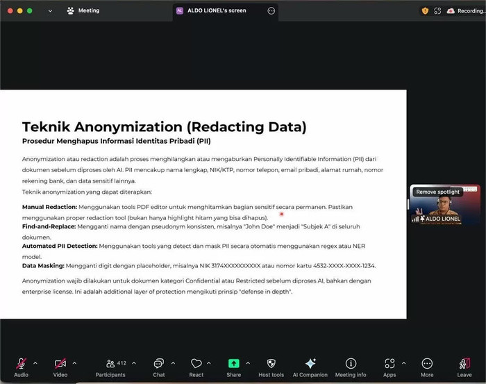 Sesi Webinar “Smart Archiving & AI-Powered Document Management” dibawakan oleh seorang pembicara ahli di bidang AI, yaitu Aldo Lionel Saonard selaku AI Expert & Data Engineer. Sesi pemaparan materi oleh pembicara berlangsung secara interaktif dan praktikal dengan hadirnya sesi praktik menggunakan platform AI yaitu Microsoft Copilot. Pembicara mengajak peserta untuk menganalisis suatu dokumen dengan tulisan tangan menggunakan Microsoft Copilot untuk menguji bagaimana AI mampu memberikan informasi secara lengkap pada dokumen dengan tulisan tangan tersebut menjadi dokumen digital dengan data yang sesuai.