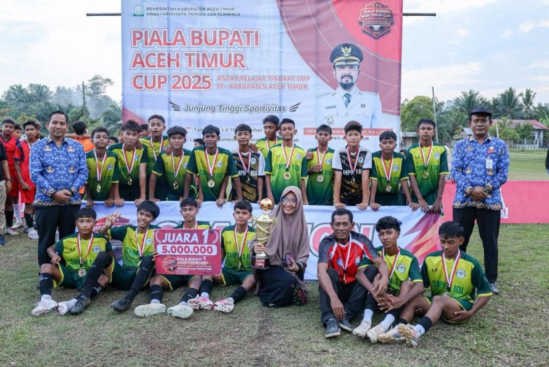 Aceh Timur, Sriwijayatoday.com — Turnamen sepak bola Piala Bupati Aceh Timur tingkat SMP resmi berakhir dengan kemenangan gemilang tim SMPN 1 Idi Rayeuk. Dalam partai final yang berlangsung di Lapangan Seuneubok Peusangan, Senin sore (10/11/2025), mereka menundukkan lawannya SMP N 2 Idi Timur dengan skor telak 5–0.