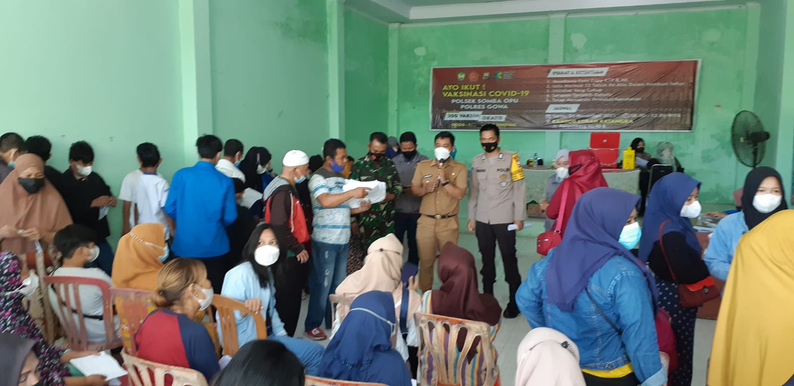 “Ditambahkan tiga pilar dalam himbauannya agar tertib dalam melaksanakan kegiatan ini dengan duduk ditempat yang sudah disediakan, tidak melepas masker dan antri sesuai nomor urut antrian yang diberikan masing-masing.” jelasnya.