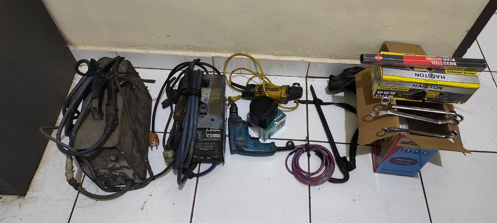 Berikut ini adalah barang bukti yang berhasil disita Polisi dari tangan tersangka AS: 1 unit Trafo las 900 Watt merk Rhino, 1 unit Trafo las 450 Watt merk Rhino, 1 unit Gerinda merk Haston, 1 unit mini speaker aktif merk Niko, 1 unit bor merk BOSCH, dan Kunci ring pas ukuran 8,10,12,13, dan 14.