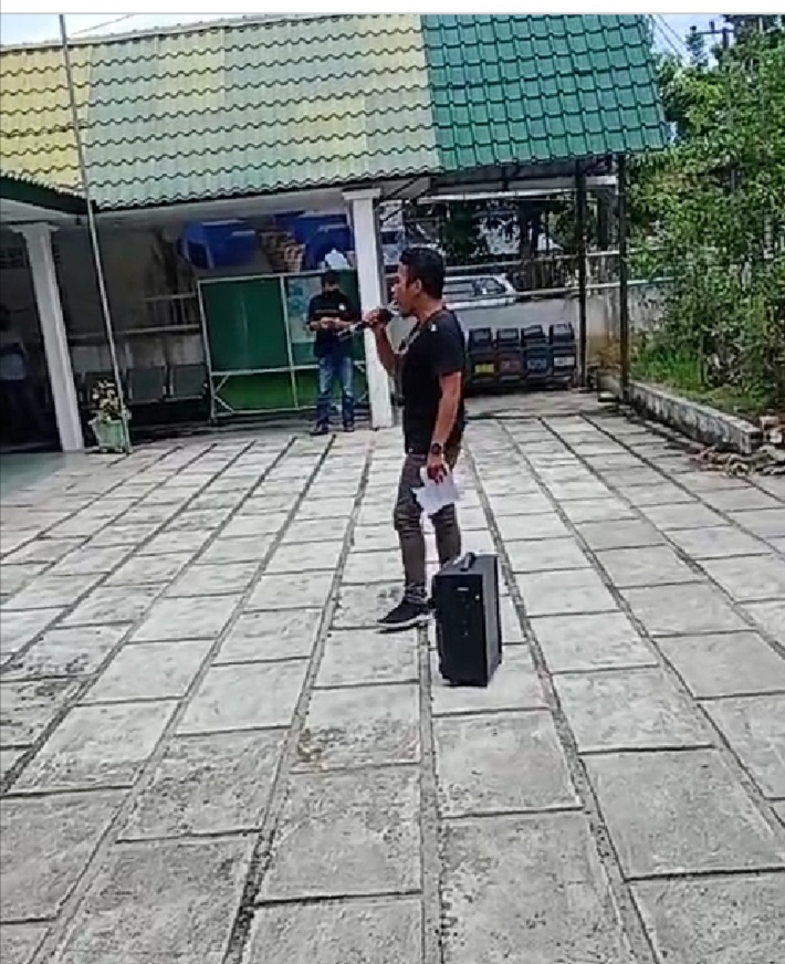 Ket Foto : Rudy Bakti, ST saat memberikan Orasi di depan kantor Disnaker Kota Tanjungbalai terkait tenaga Kerja Sukarela yang dipecat sepihak.