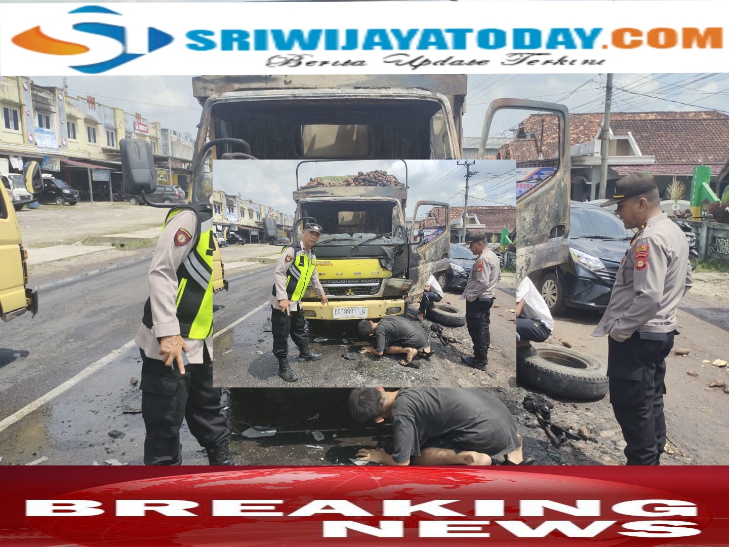 Satu unit truck Colt Diesel jenis Mitsubishi Canter berwarna kuning bermuatan ubi rambat dengan no Polisi BG 8601 W hangus terbakar.