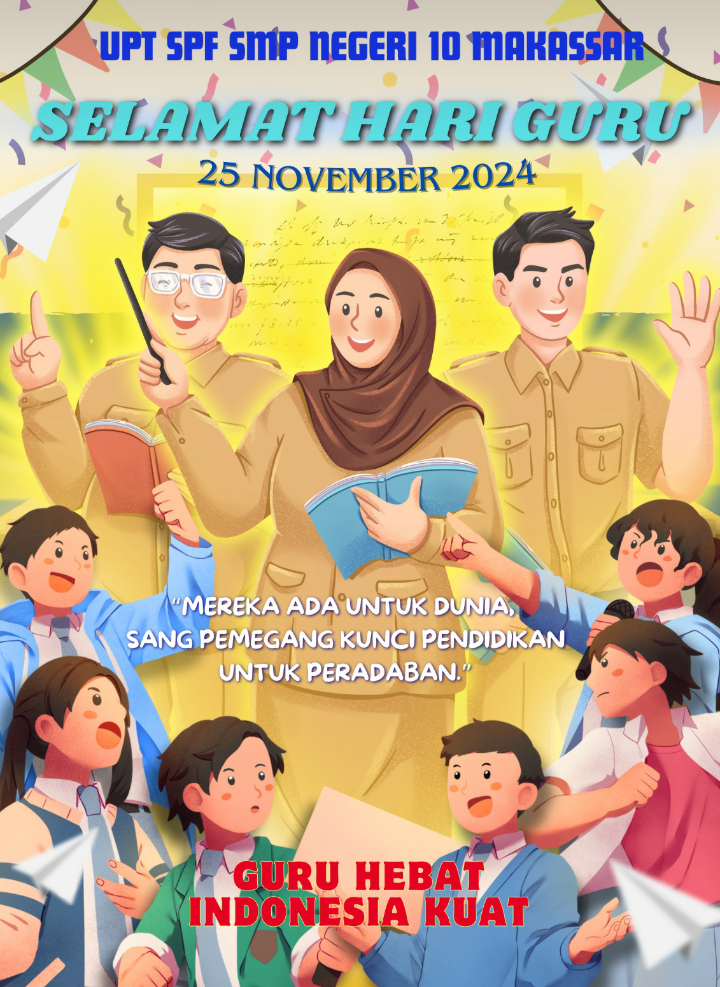 Makassar, 25 November 2024 – UPT SPF SMP Negeri 10 Makassar merayakan Hari Guru Nasional 2024 dengan penuh semangat dan apresiasi. Acara yang dirayakan pada tanggal 25 November 2024 ini menampilkan ilustrasi para guru yang digambarkan sebagai pahlawan pendidikan. Ilustrasi tersebut menggambarkan dedikasi dan peran penting guru dalam membentuk peradaban.