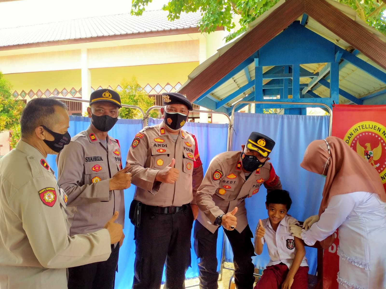Selain melakukan monitoring, tampak pria nomor dua di jajaran Polres Lhokseumawe ini turut mendampingi langsung murid SD yang sedang ikut vaksin.
