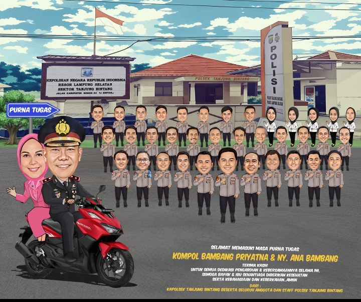“Selamat memasuki Purna kepada Wakapolsek Tanjung Bintang Kompol Bambang Priyatna semoga semakin sukses dan tetap terjalin hubungan silahturahmi yang sudah baik menjadi lebih erat lagi, senantiasa diberikan kesehatan bersama keluarga tercinta.