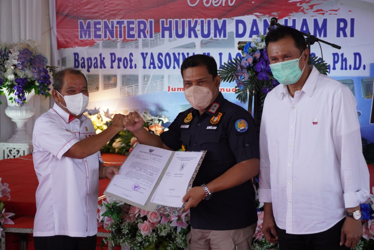 Gunungsitoli, Nias | Sriwijayatoday.com – Walikota Gunungsitoli Lakhomizaro Zebua menyerahkan Sertifikat Tanah dan Bangunan Hibah kepada Kepala Kantor Imigrasi Sibolga Saroha Manullang bersama dengan Kakanwil Kementerian Hukum dan HAM Sumatera Utara Imam Suyudi. Penyerahan tersebut disaksikan langsung oleh Menteri Hukum dan HAM Yasonna Laoly di sela melakukan kunjungan kerja di Kepulauan Nias, Jumat (28/01).