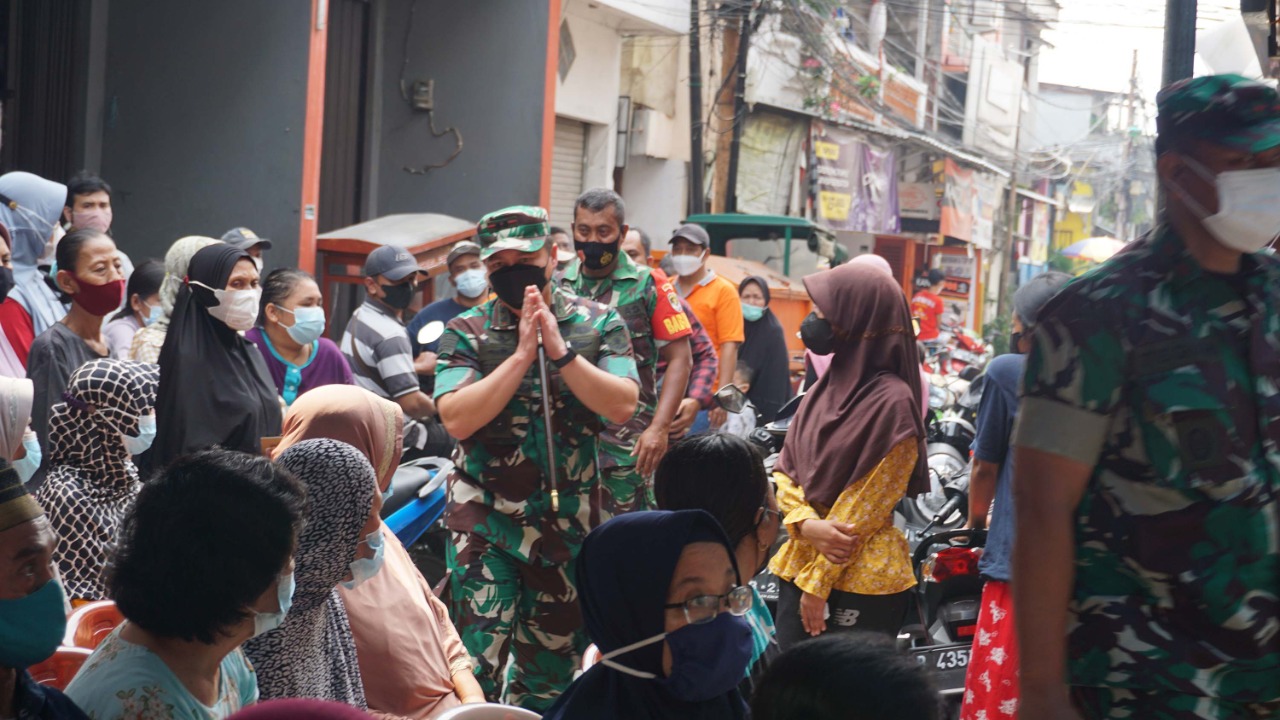 Kegiatan dilanjutkan dengan penyerahan secara simbolis bantuan paket sembako oleh Dandim 0502/JU kepada warga.