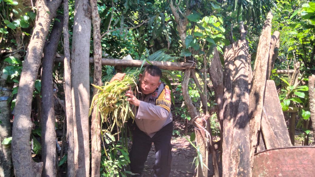 Selain melaksanakan sambang, Bhabinkamtibmas Desa Pakatto itu terlihat turut membantu warga binaannya bernama Sabang Dg. Mone beserta keluarga yang lagi membawa rumput gajah untuk pakan ternak sapinya.