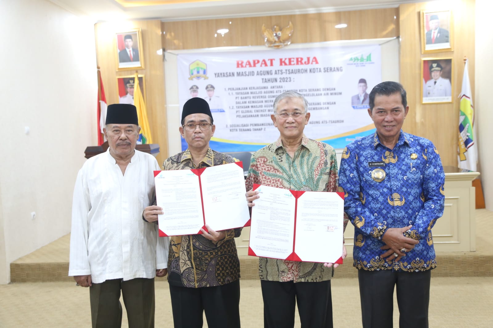 Wali Kota Serang Syafrudin berkesempatan hadir dalam kegiatan penandatanganan perjanjian kerjasama antara masjid agung At-Tsauroh Kota Serang dengan PT. Banyu Reverse Osmosis dan PT. Global Energy Multazam yang dilaksanakan di Aula Setda Kota Serang, Jum’at (17/03).